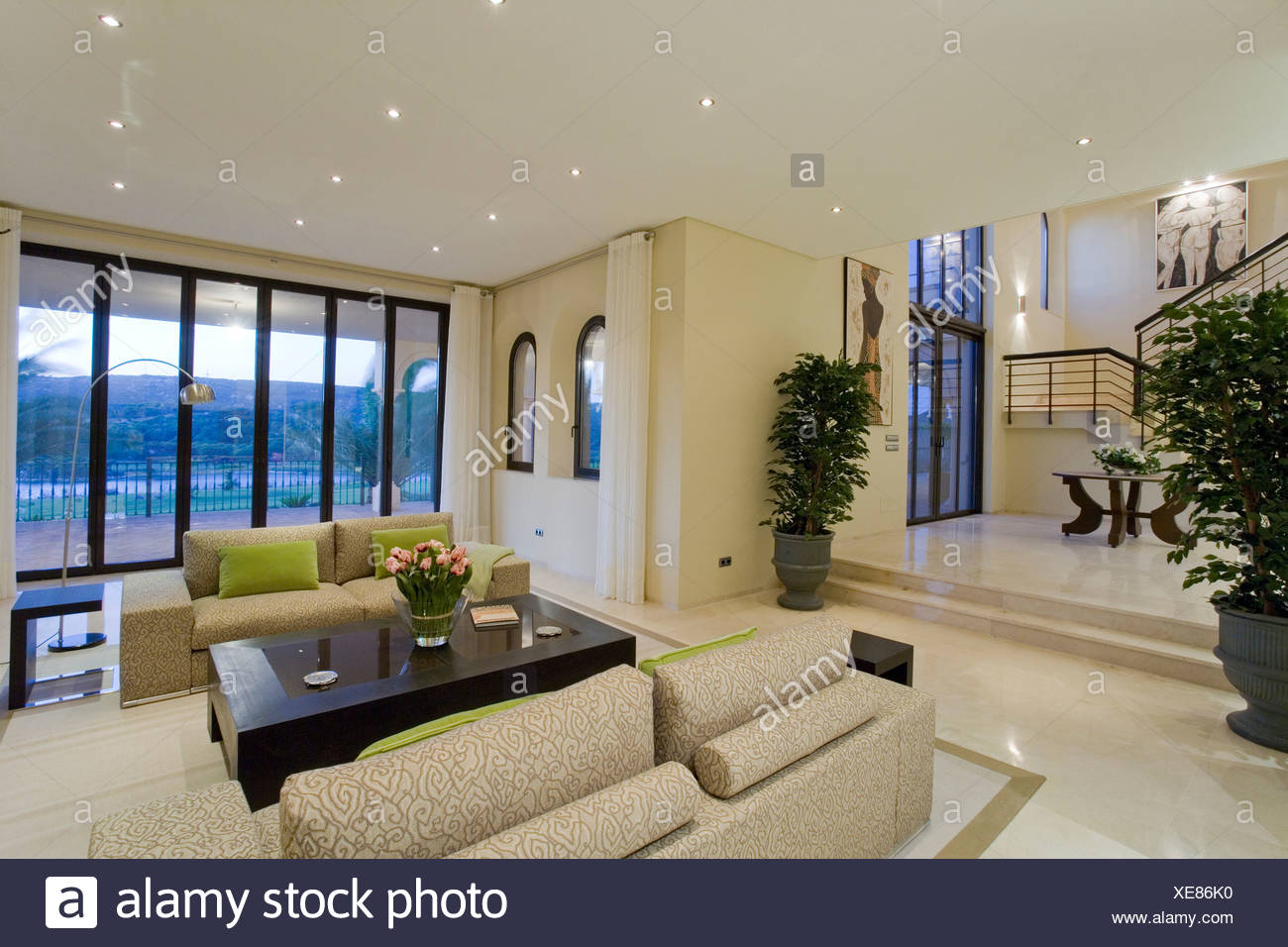 Beige Sofas And Black Coffee Table In Large Openplan Living Room
